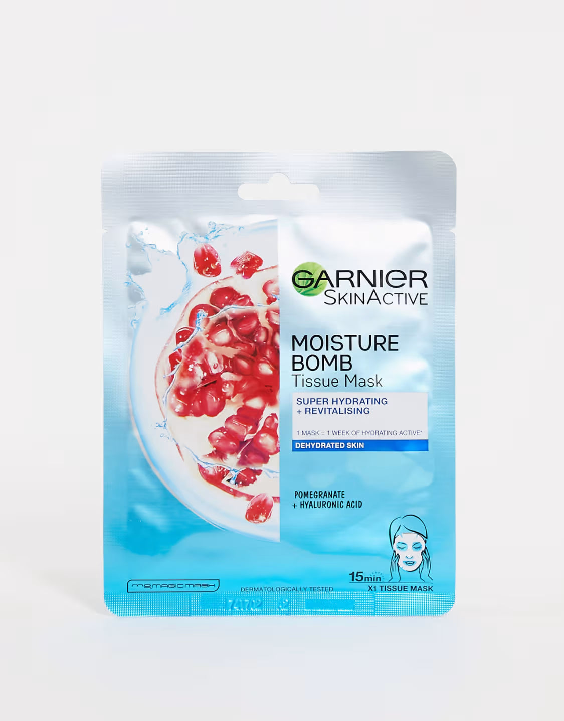 Treat dehydrated skin to the replenishing properties of the Garnier Moisture Bomb Pomegranate Hydrating Face Sheet Mask, a super-hydrating sheet mask inspired by Asian skincare.