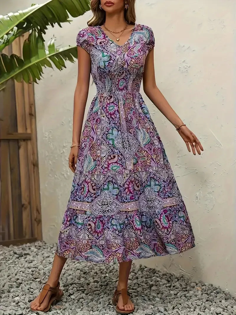 Plus Size Printed V-Neck Short Sleeve Midi Dress
